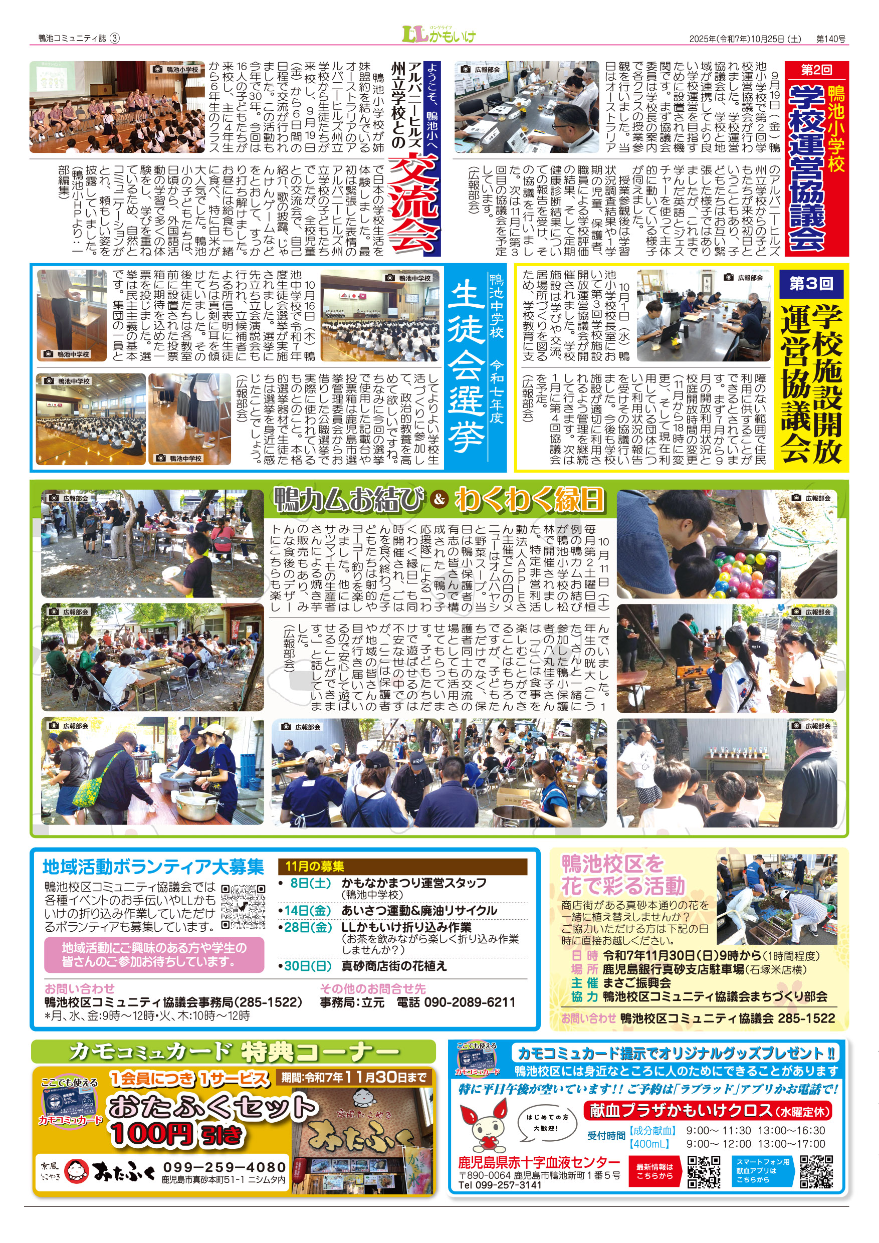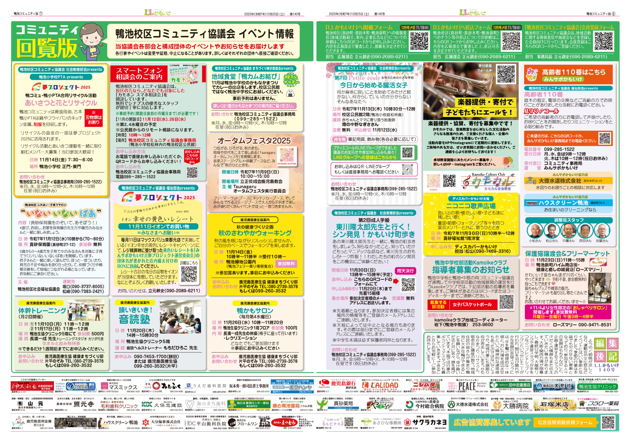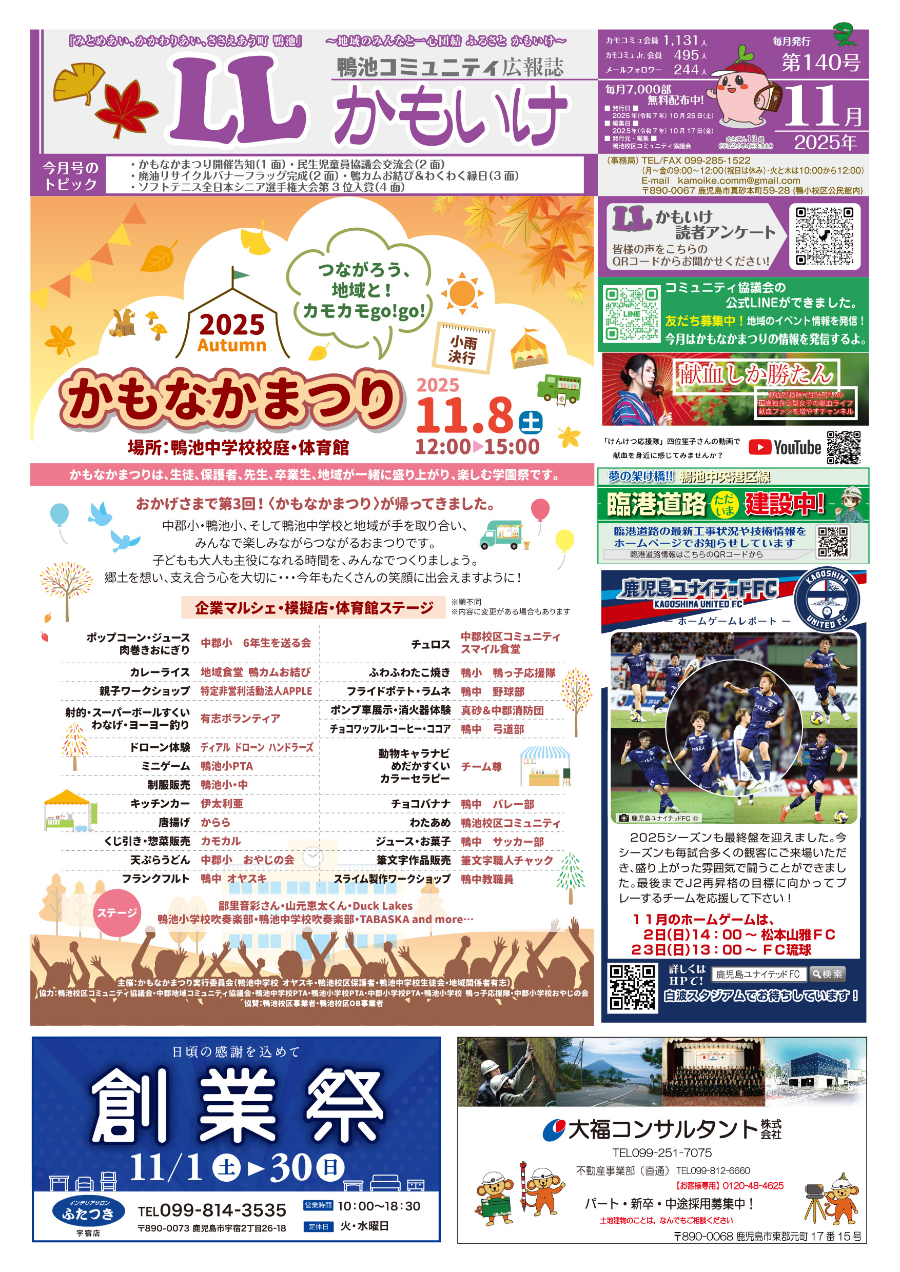 LLかもいけ2025年11月号(第140号)を発行しました! 2025.10.23 ・かもなかまつり開催告知(1面)・民生児童員協議会交流会(2面) ・廃油リサイクルバナーフラッグ完成(2面)・鴨カムお結び&わくわく縁日(3面) ・ソフトテニス全日本シニア選手権大会第3位入賞(4面)