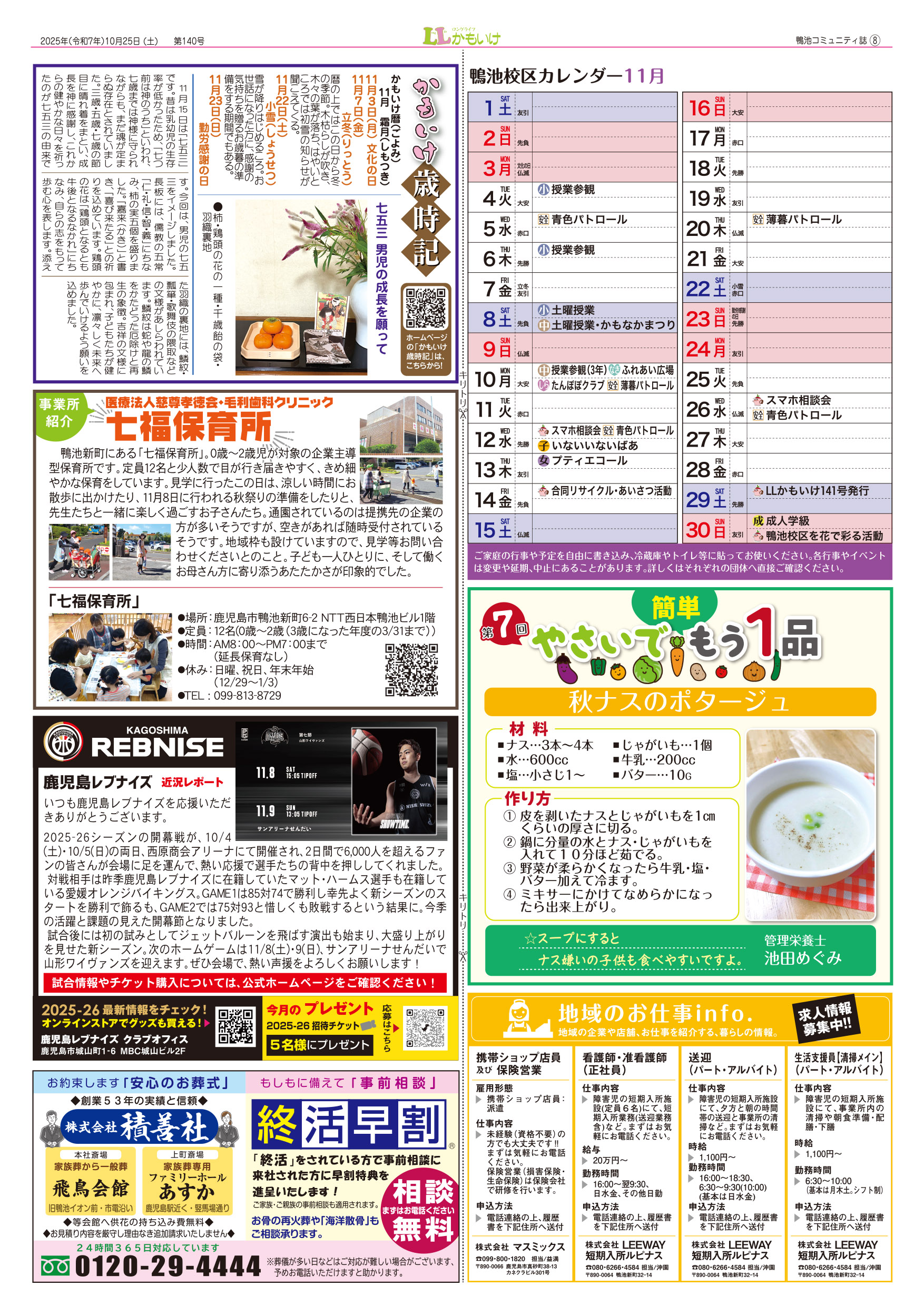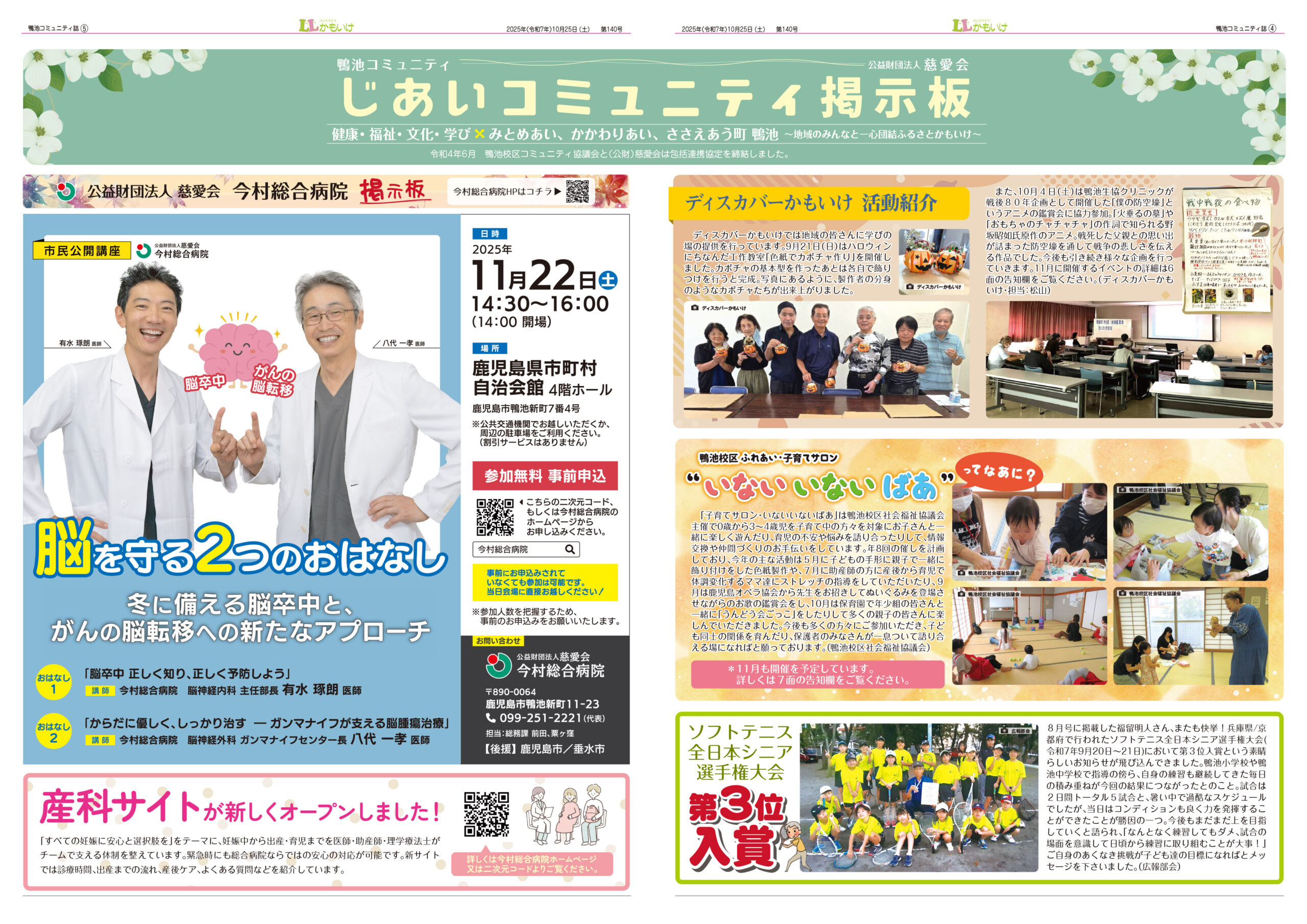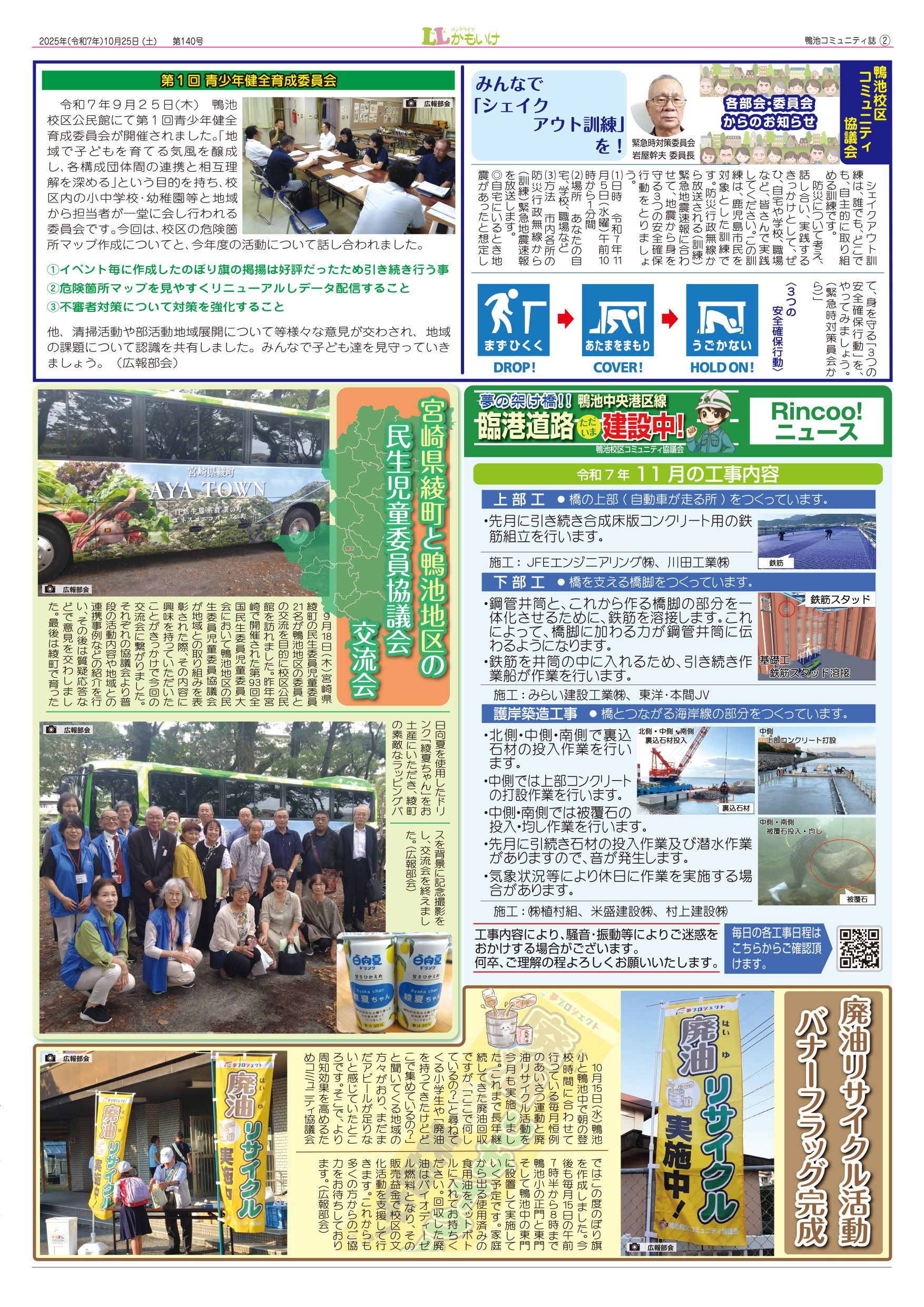 LLかもいけ2025年11月号(第140号)を発行しました! 2025.10.23 ・かもなかまつり開催告知(1面)・民生児童員協議会交流会(2面) ・廃油リサイクルバナーフラッグ完成(2面)・鴨カムお結び&わくわく縁日(3面) ・ソフトテニス全日本シニア選手権大会第3位入賞(4面)