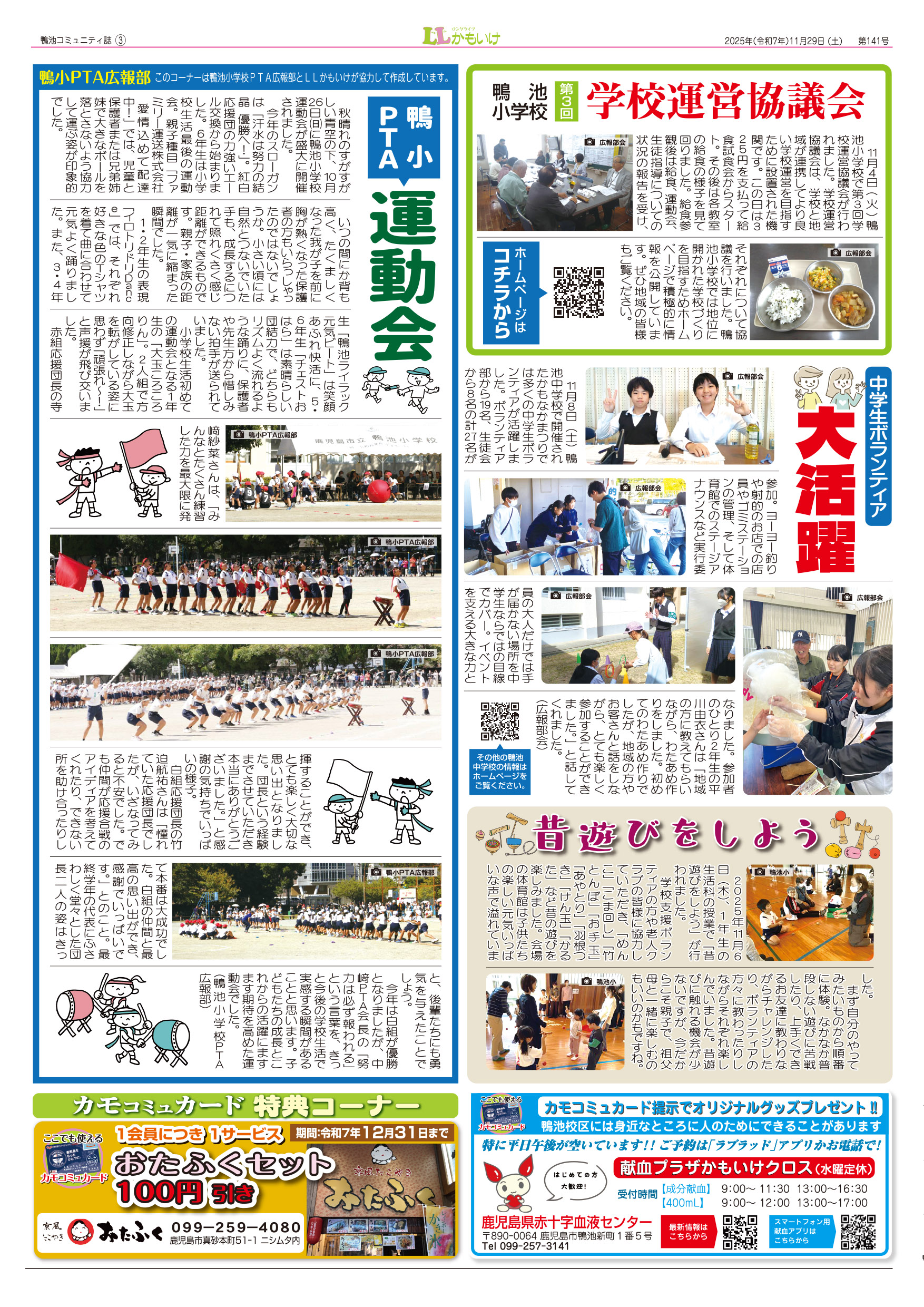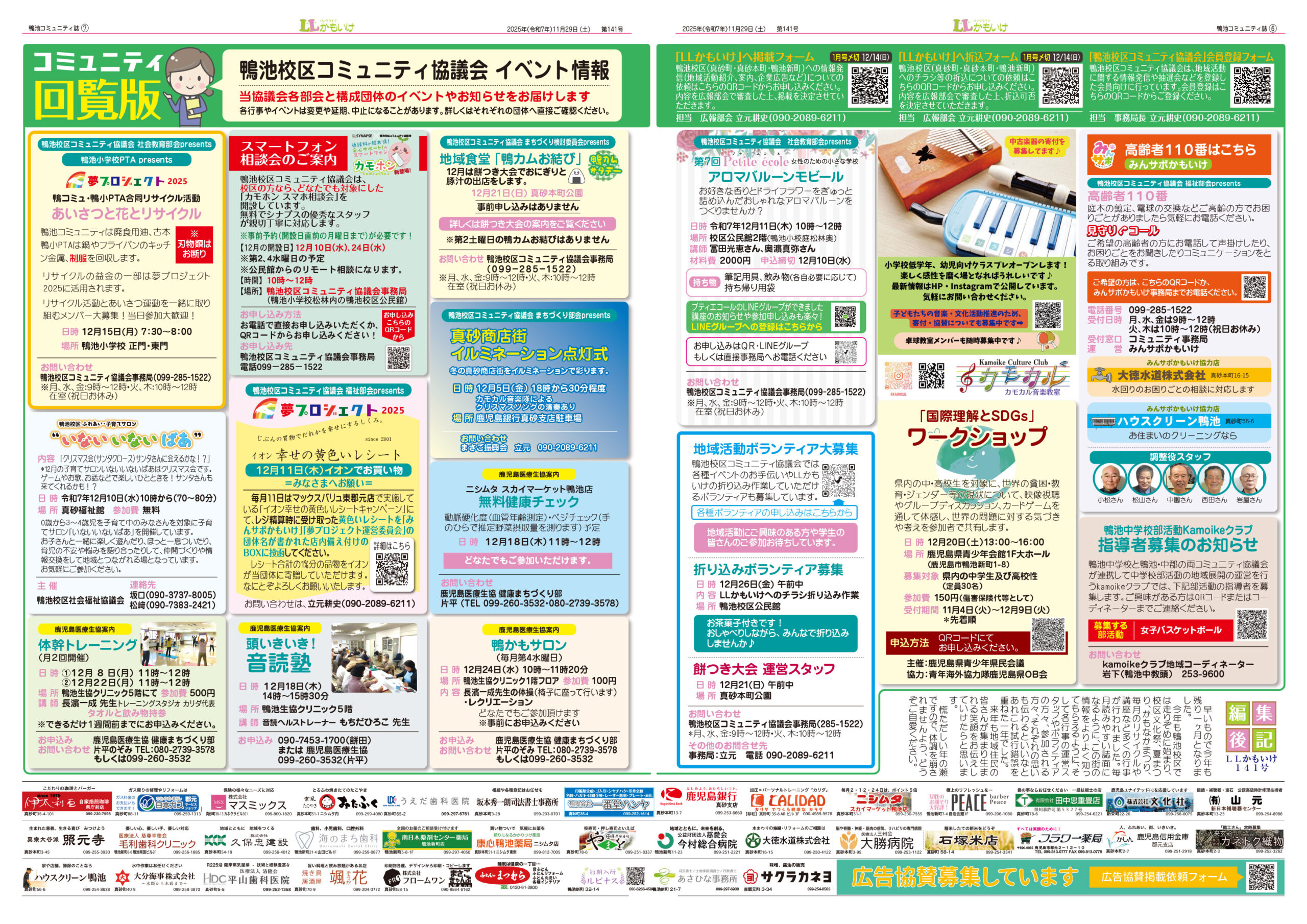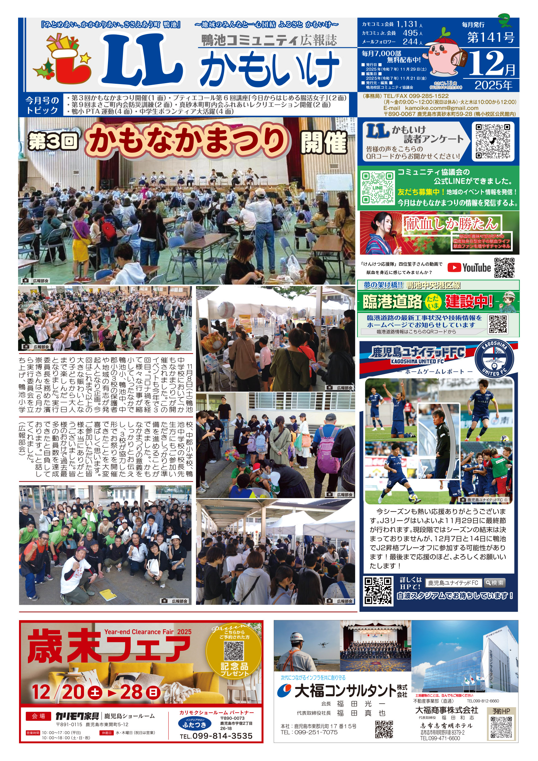 LLかもいけ2025年12月号(第141号)を発行しました! 2025.11.27 ・第3回かもなかまつり開催(1面)・プティエコール第6回講座「今日からはじめる腸活女子」(2面) ・第9回まさご町内会防災訓練(2面)・真砂本町町内会ふれあいレクリエーション開催(2面) ・鴨小PTA運動(4面)・中学生ボランティア大活躍(4面)