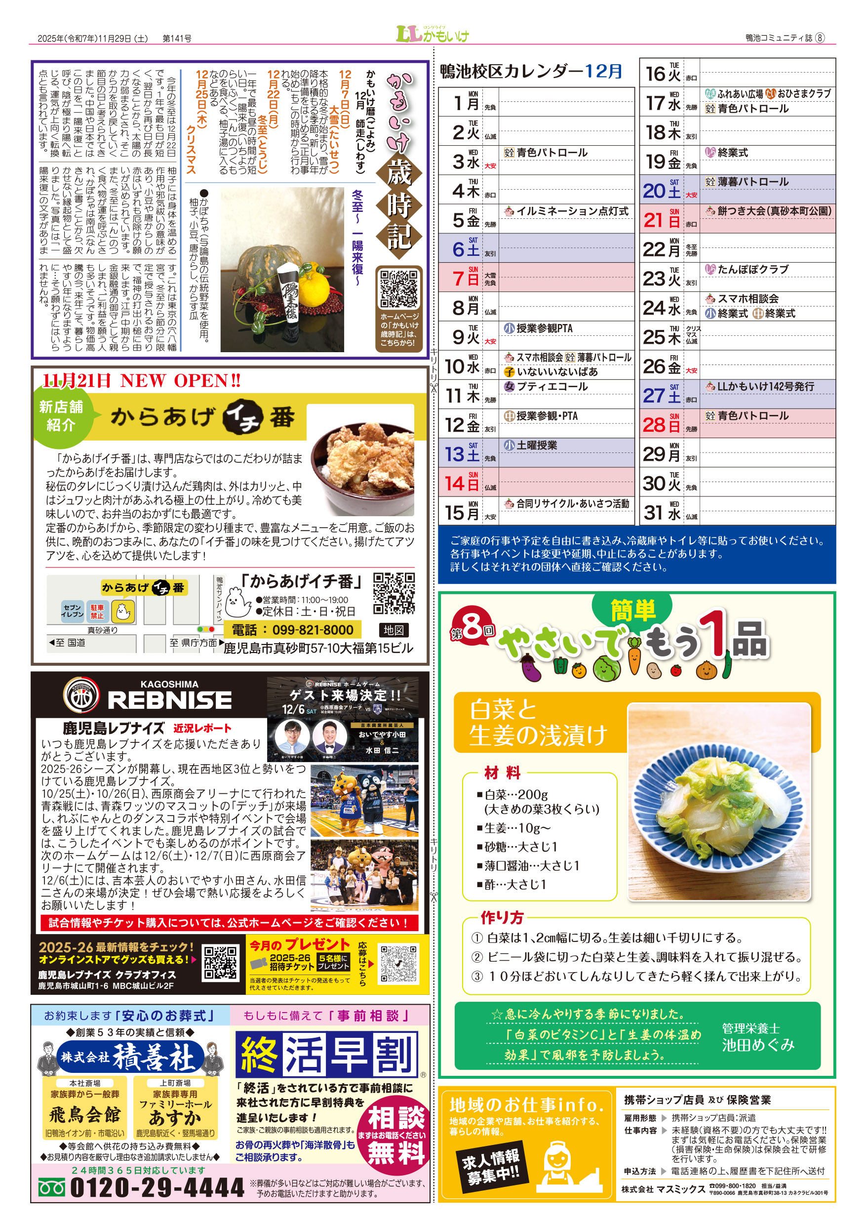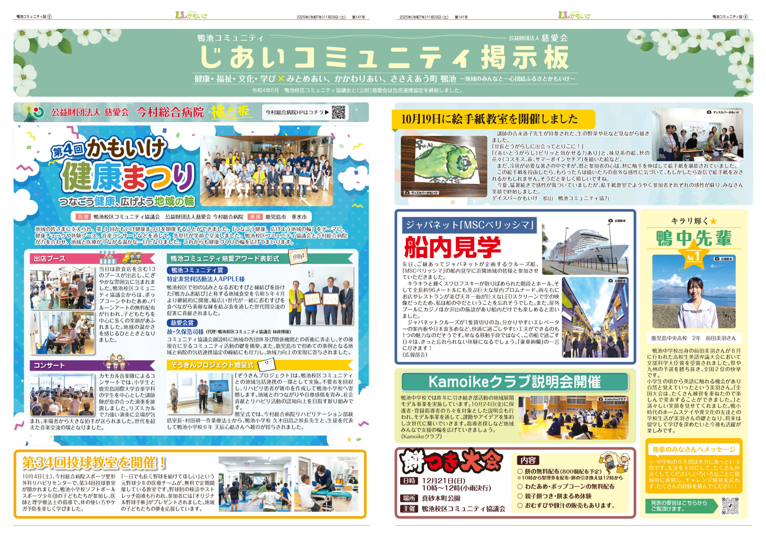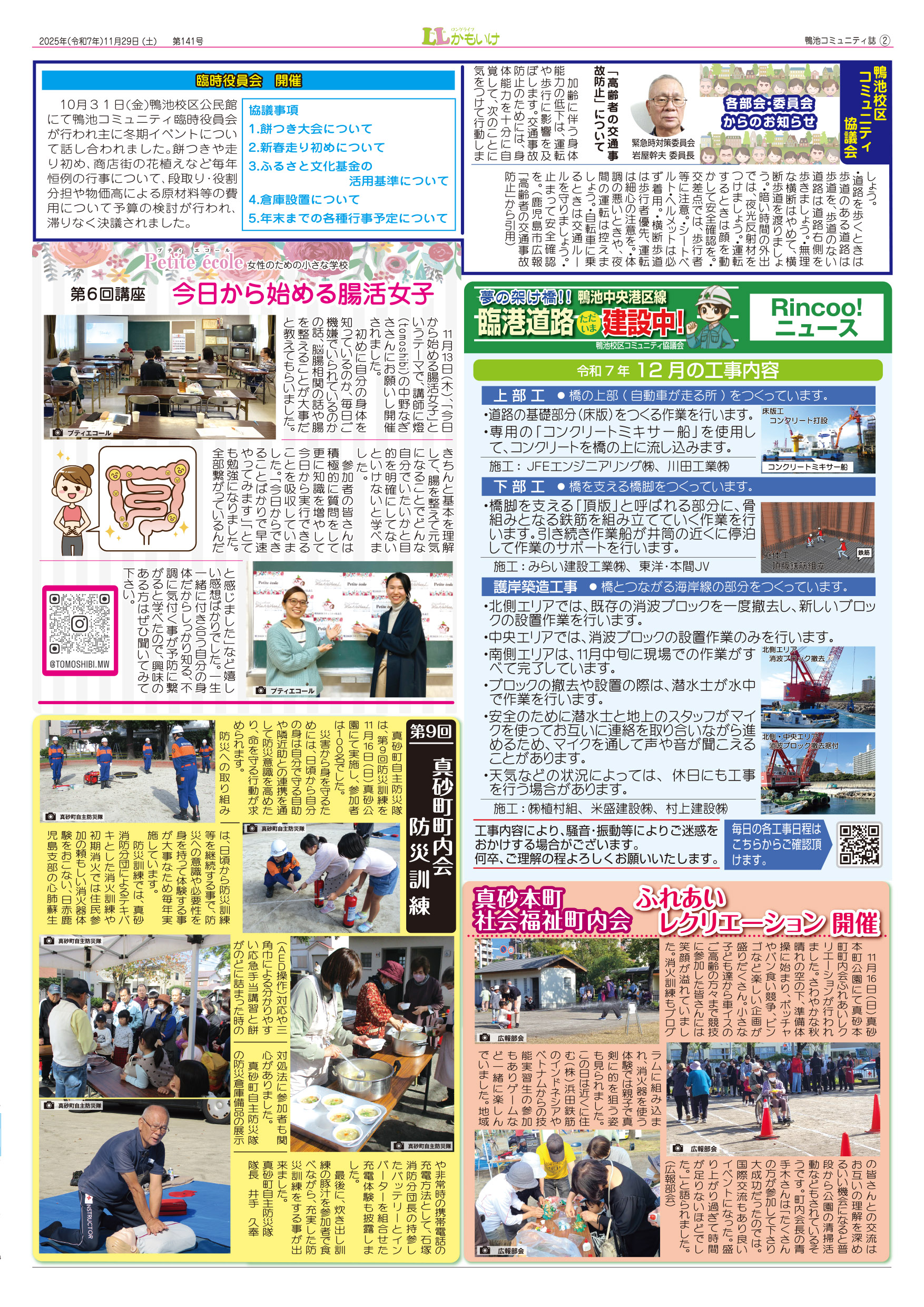 LLかもいけ2025年12月号(第141号)を発行しました! 2025.11.27 ・第3回かもなかまつり開催(1面)・プティエコール第6回講座「今日からはじめる腸活女子」(2面) ・第9回まさご町内会防災訓練(2面)・真砂本町町内会ふれあいレクリエーション開催(2面) ・鴨小PTA運動(4面)・中学生ボランティア大活躍(4面)