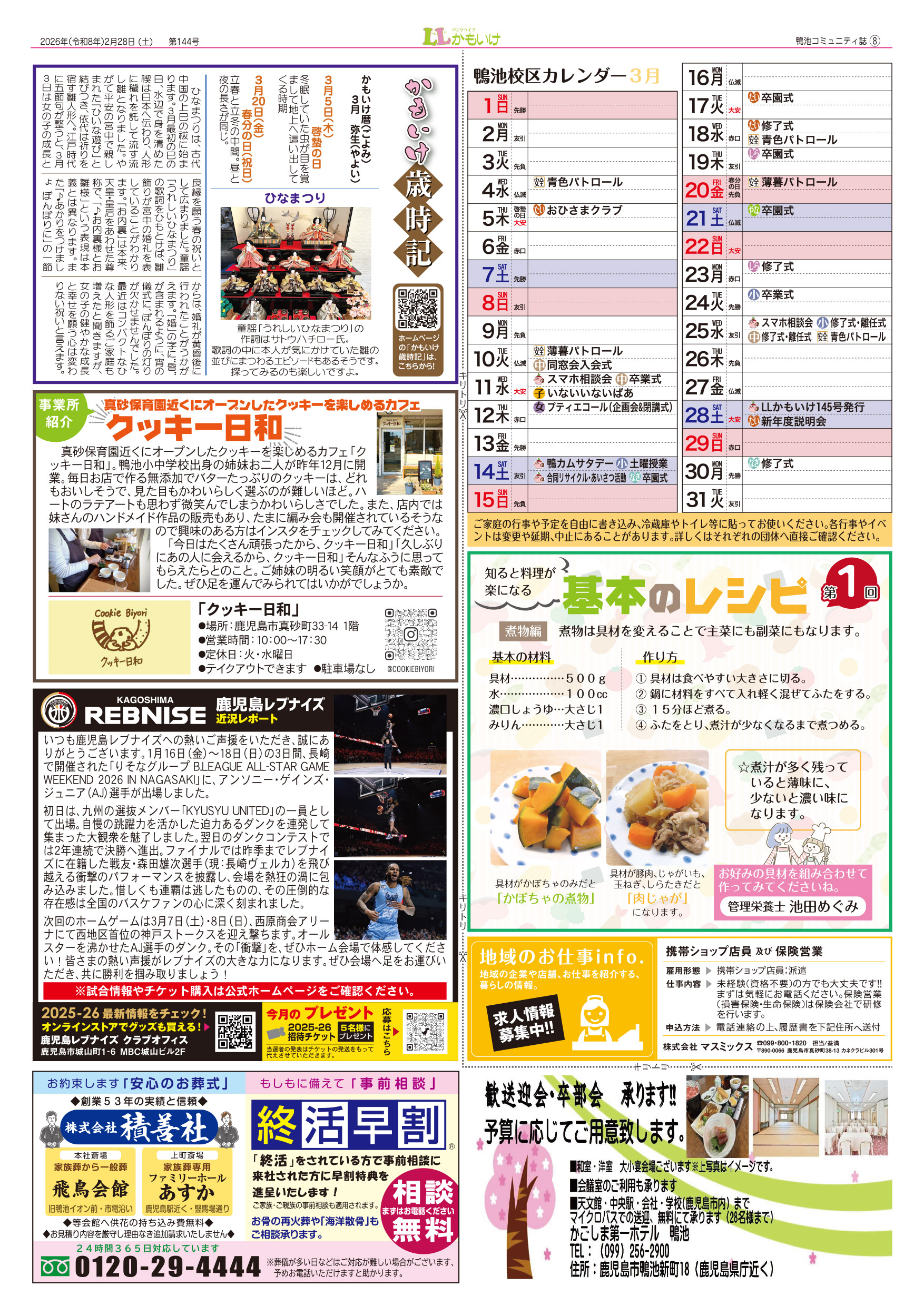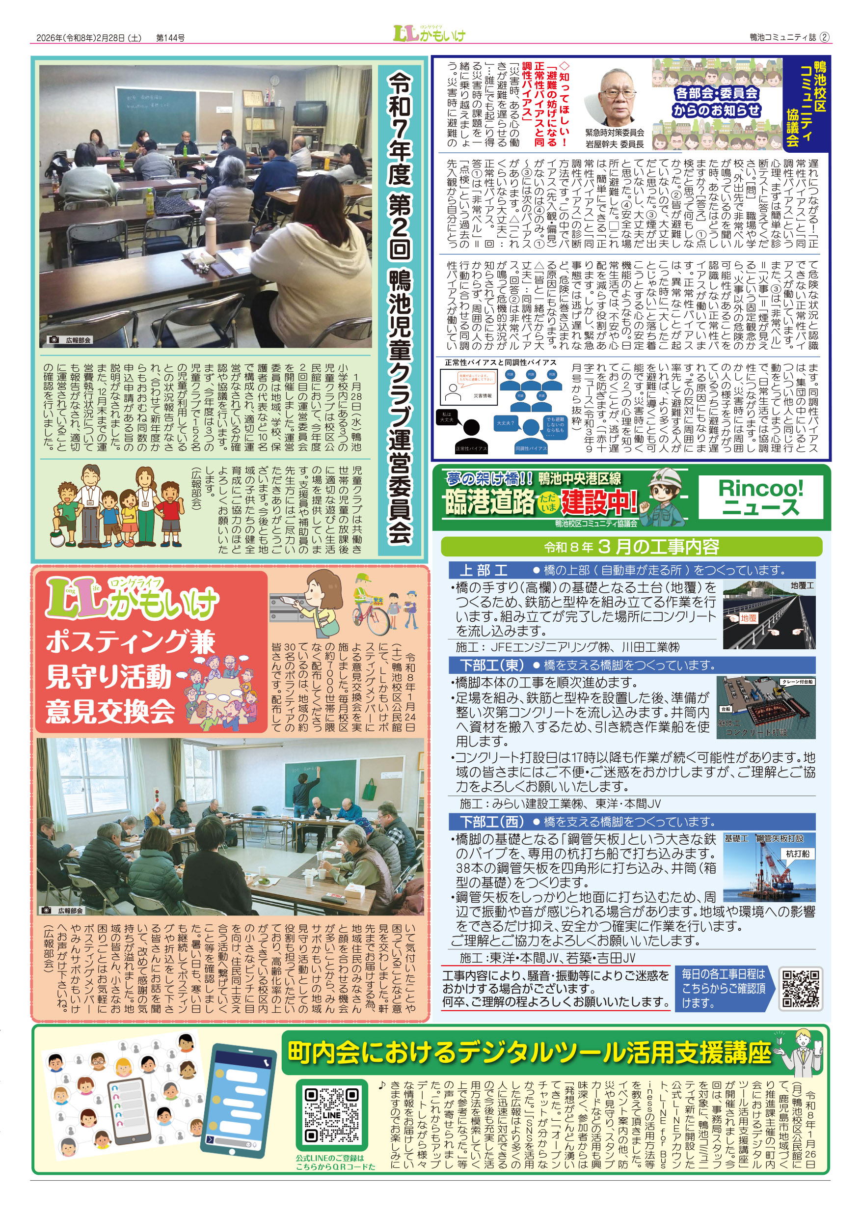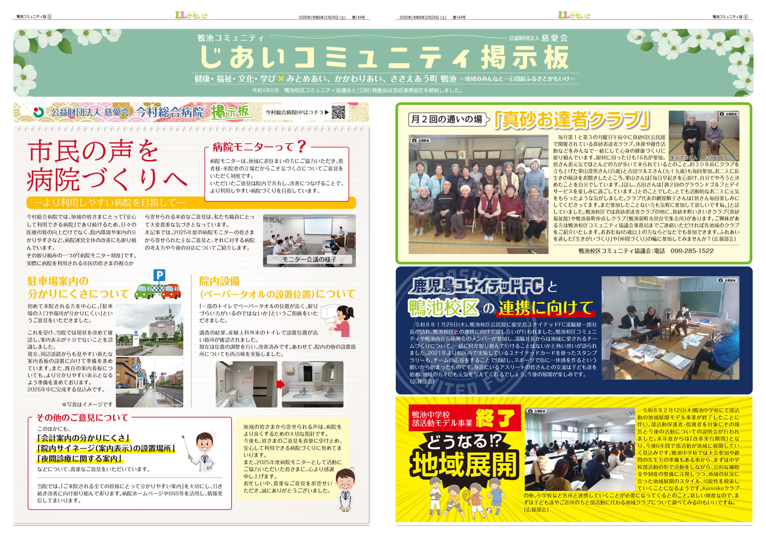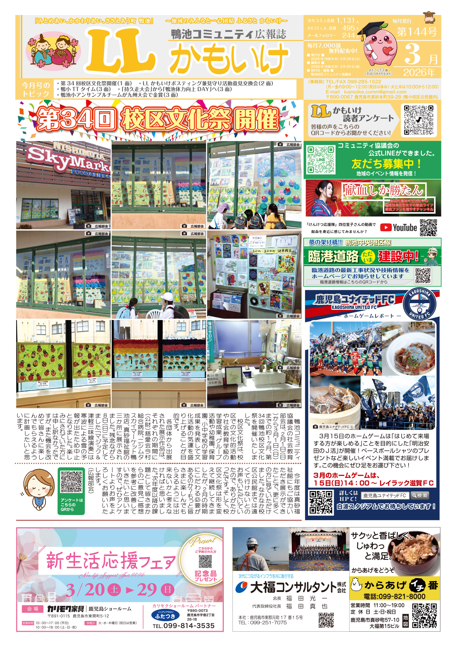 LLかもいけ2026年3月号(第144号)を発行しました! 2026.02.26 ・第34回校区文化祭開催(1面) ・LLかもいけポスティング兼見守り活動意見交換会(2面) ・鴨小TTタイム(3面) ・「持久走大会」から「鴨池体力向上DAY」へ(3面) ・鴨池小アンサンブルチームが九州大会で金賞(3面)