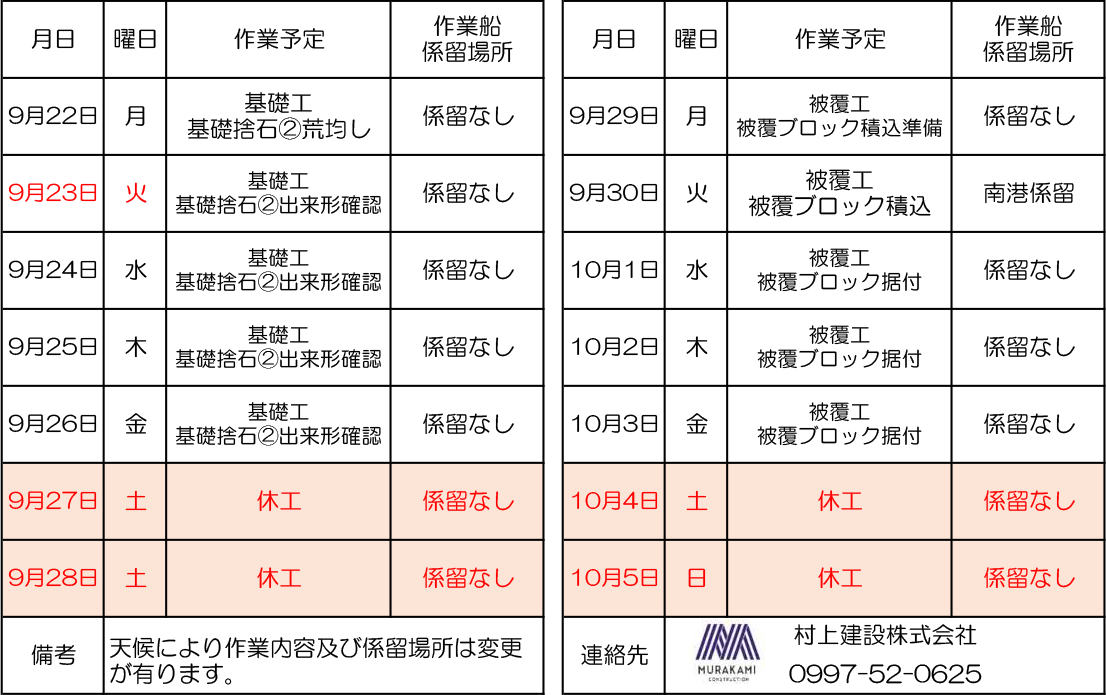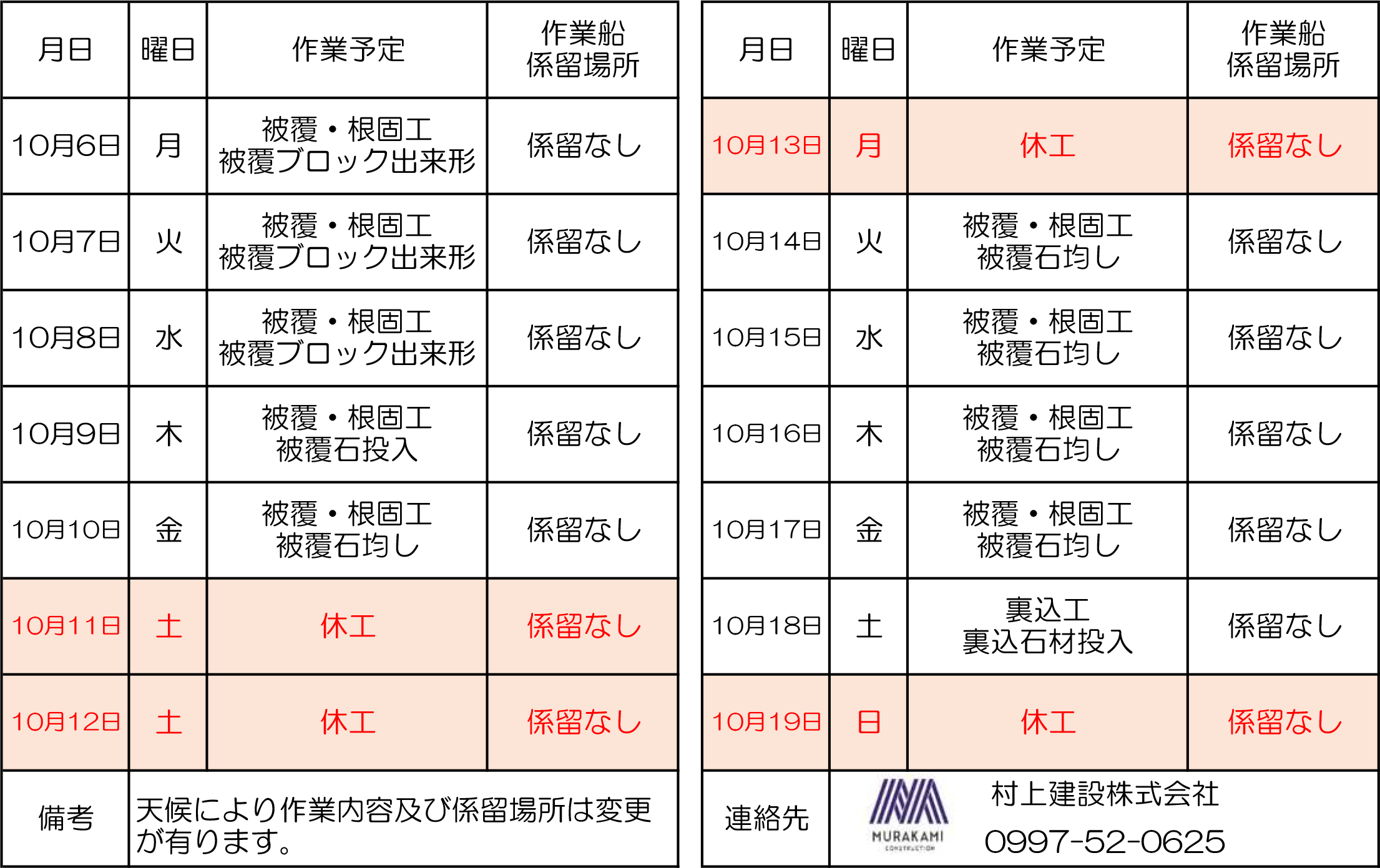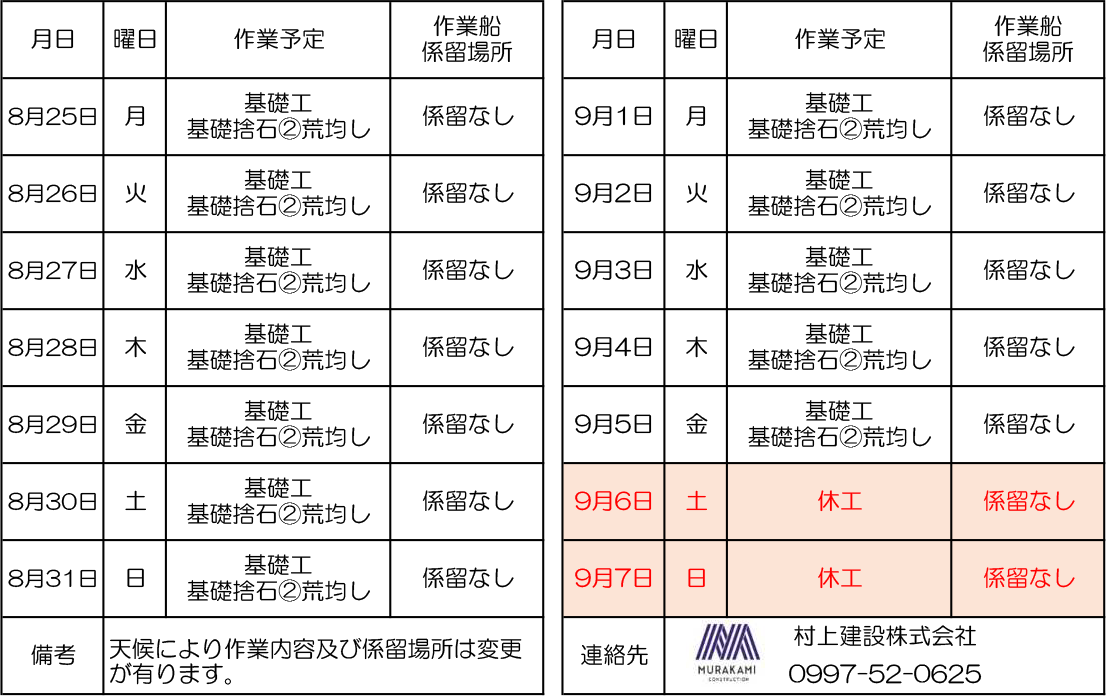 令和6年度護岸築造工事(第7次)の週間工程表:村上建設(株)