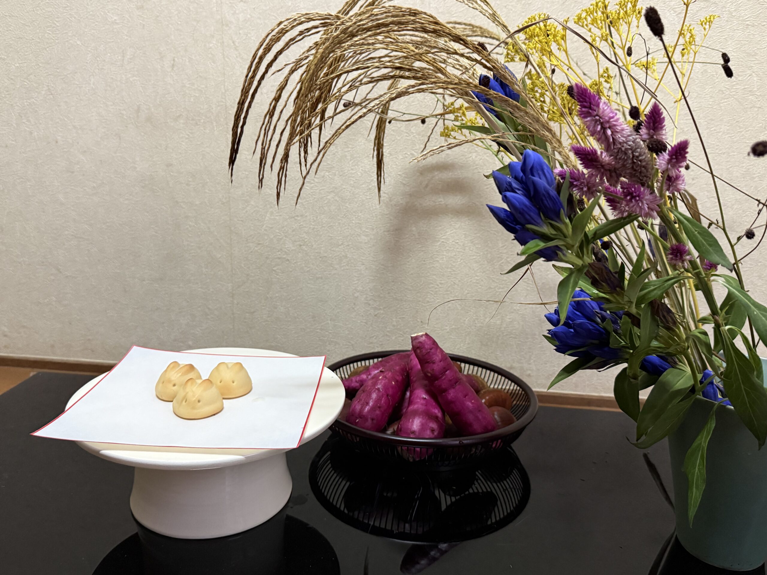 写真キャプション ススキ・オミナエシ・ワレモコウ・りんどう・うさぎのお菓子・さつまいも