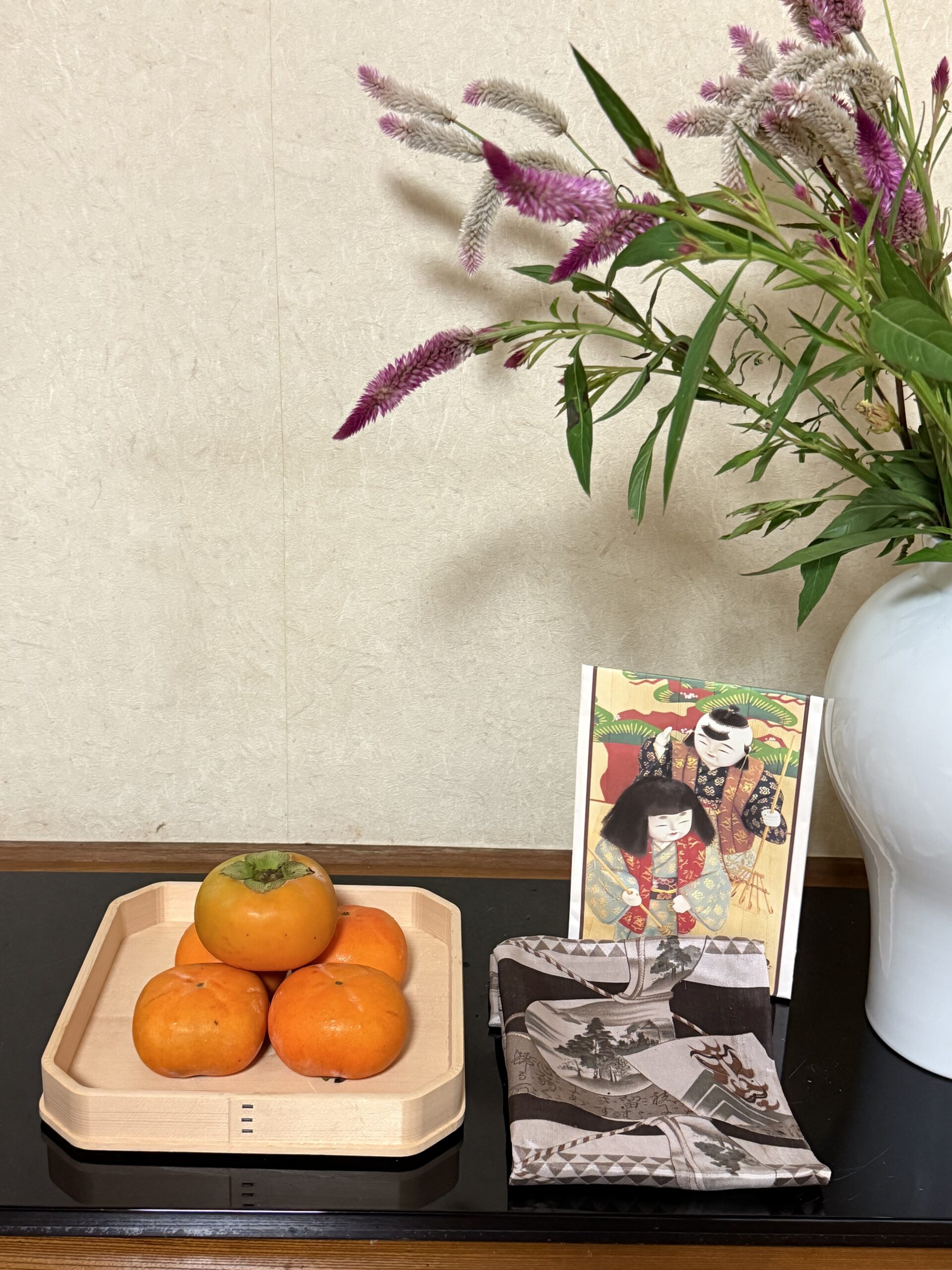11月15日は「七五三」です。昔は乳幼児の生存率が低かったため、「七つ前は神のうち」といわれ、七歳までは神様に守られながらも、まだ魂が定まらぬ存在とされていました。三歳・五歳・七歳の節目に晴れ着をまとい、成長を神に感謝し、これからの健やかな日々を祈ったのが七五三の由来です。今回は、男児の七五三をイメージしました。長板には、儒教の五常「仁・礼・信・智・義」にちなみ、柿の実五個を盛りました。「嘉来(かき)」と書き、「喜び来たる」との祈りを込めています。鶏頭の花は「鶏頭となるとも牛後となるなかれ」にちなみ、自らの志をもって歩む心を表します。添えた羽織の裏地には、鱗紋・瓢箪・歌舞伎の隈取などの文様があしらわれています。鱗紋は蛇や龍の鱗をかたどった厄除けと再生の象徴。吉祥の文様に包まれ、子どもたちが健やかに、凛々しく未来へ歩んでいけるよう願いを込めました。