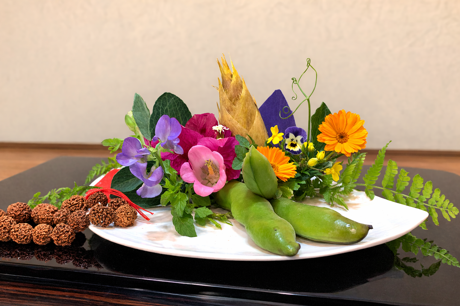 4月8日は「花祭り」。灌仏会(かんぶつえ)、仏生会(ぶっしょうえ)とも呼ばれ、お釈迦さまの誕生を祝う仏教の行事です。伝承によれば、お釈迦さまはルンビニの花園で生まれたと伝えられています。その情景にならい、寺の境内には花で美しく飾られた花御堂を設え、「天上天下唯我独尊」と唱える姿をかたどった誕生仏を安置し、産湯に見立てた甘茶をそそいで祝います。今回は、天に向かって伸びる小さな爭(たけのこ)を新しい命の象徴として誕生仏に重ね、さらに春を代表する金盞花(キンセンカ)や色とりどりの花を添えて、明るく清らかな気配を表現しました。金盞花は、黄金のように輝く花の色と、盞(さん)すなわち盃に似た丸みのある花姿に由来すると伝えられます。また、「仏豆」とも呼ばれるそら豆を添え、菩提樹の実の数珠と散華をあしらうことで、祈りの心が静かに結び合っていくよう願いを込めて盛りました。